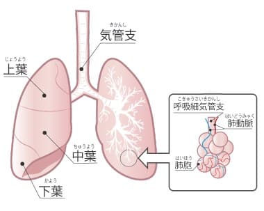 鼻や口から吸い込んだ空気は、喉頭(こうとう)を通り気道から気管に入ります。気管は左右の肺のなかに入ると2つに分かれて気管支となります。