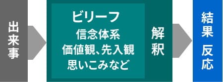 出来事や物事に対して、どう感じるか、判断するか、行動するかなどの結果の反応は、下の図のようにビリーフに影響された解釈によります。