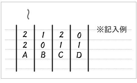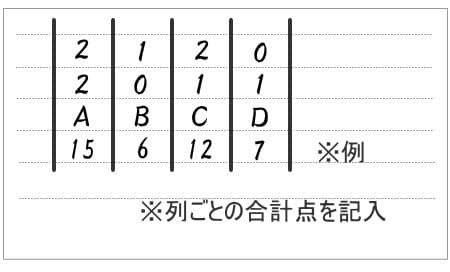そして、列ごとに縦に答えた点数を合計して、合計点をA、B、C、Dの下に記入します。それぞれAの点数、Bの点数、Cの点数、Dの点数となります。