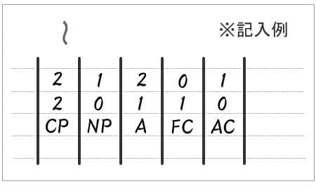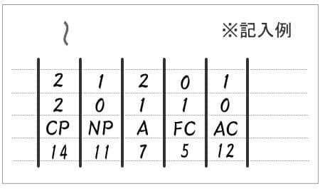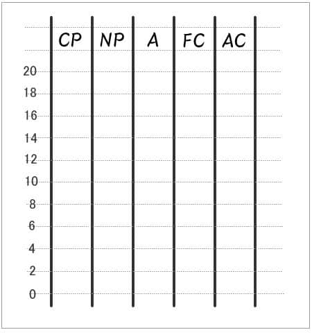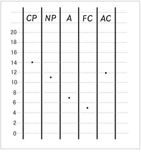 - 下記の例のように、CP、NP、A、FC、ACのそれぞれの列の中央の点数に該当するところに「・」を書きます。