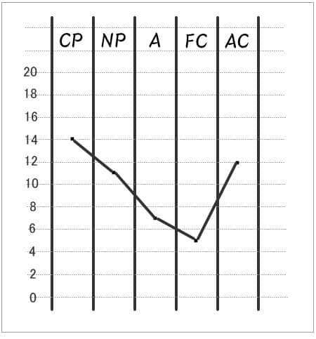 そして、列ごとに縦に答えた点数を合計して、合計点をCP、NP、A、FC、ACの下に記入します。それぞれ各自我状態の点数です。