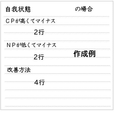 - 「CPが高くてマイナス」「NPが低くてマイナス」「改善方法」を1セットとして下記の例のように記入欄をつくります。「」内の文字を書きます。