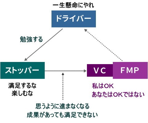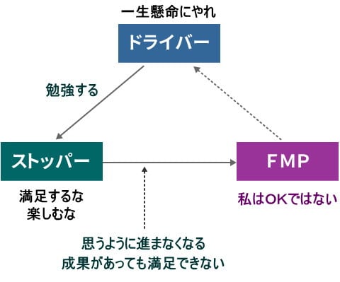 そして、思うように進まなくなったことで挫折感を持ったり、成果に満足できず、「私はOKではない」という感情(ラケット感情、FMPという)を持ちます。