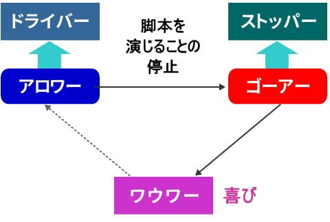 ステップ3のように、ドライバーにアロワーで、ストッパーにゴーアーで対処するようにすると、人生脚本を演じることが停止されます。