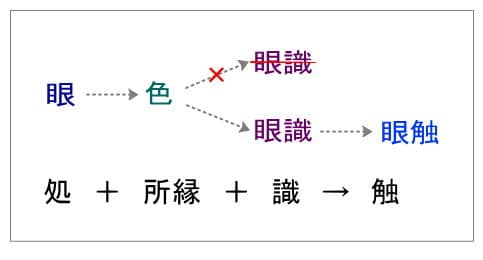 そして、処と所縁と識の3つがそろったとき触が生じます。接触の触とまぎらわしいですが、この触は認識のことです。識は「見た」など所縁を認めた段階、触はそれ以上に認識した段階です。