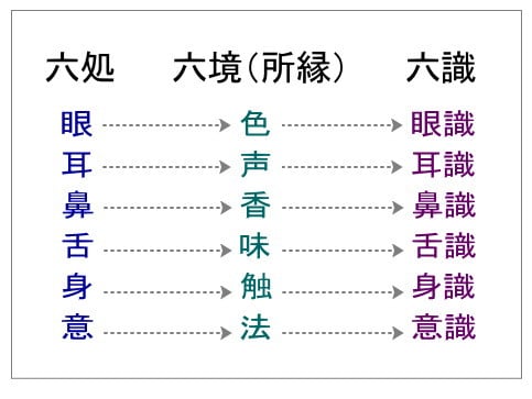 六処にはそれぞれに認識する対象があり、対象は所縁または縁境と呼ばれ、例えば眼が認識する対象・所縁は色(物質)というように、六処に対して六境「色、声、香、味、触、法」(しきしょうこうみそくほう)があります。