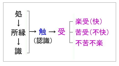 苦の生じる縁起の順の十二因縁「無明 → 行 → 識 → 名色 → 六処 → 触 → 受 → 渇愛 → 取 → 有 → 生 → 老死」では、受の次は渇愛になっています。