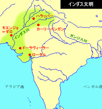 紀元前2600年頃、インド北西部にある大河のインダス川のほとりに世界四大文明の1つインダス文明が生まれました。インダス文明はモヘンジョダロなど遺跡で知られていますが、詳細はインダス文字が未解読なためまだ不明です。住んでいたのはドラヴィダ人で農耕民族でした。